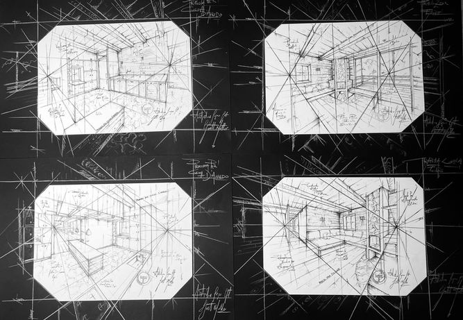 Ogni progetto viene disegnato a mano con cura e attenzione del dettaglio. Bozzetti che vengono pensati, realizzati e modellati dalla passione e conoscenza di Matteo che con carta e penna racconta i luoghi del vivere quotidiano.